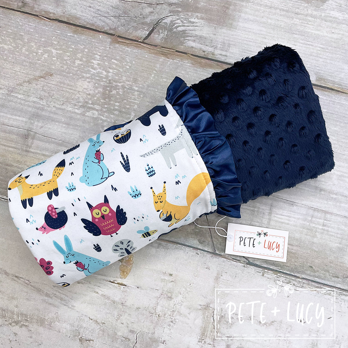 Very soft and snuggly, this blanket is sure to be a favorite! Top side of the blanket is covered in a fun Woodland Animal Print complete with Owls, Foxes, Trees, Bears, and more. Back side of the blanket is a solid navy blue plush that is super snuggly and sure to keep baby warm. Both sides are brought together with a beautiful satin ruffled edge.